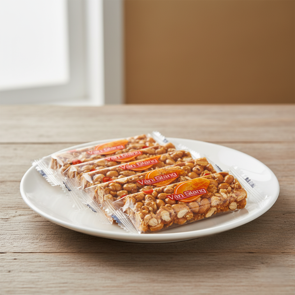 Enjoy the classic Vietnamese treat, Kẹo Lạc Vân Giang Peanut Brittle (မြေပဲယို). This crisp and satisfying candy blends whole roasted peanuts with caramelized sugar, delivering a delicious balance of sweet and salty flavors. Each 220g pack includes individually portioned bars, perfect for a quick energy boost or pairing with a warm cup of tea. Experience this traditional Vietnamese confection and its irresistible nutty crunch.