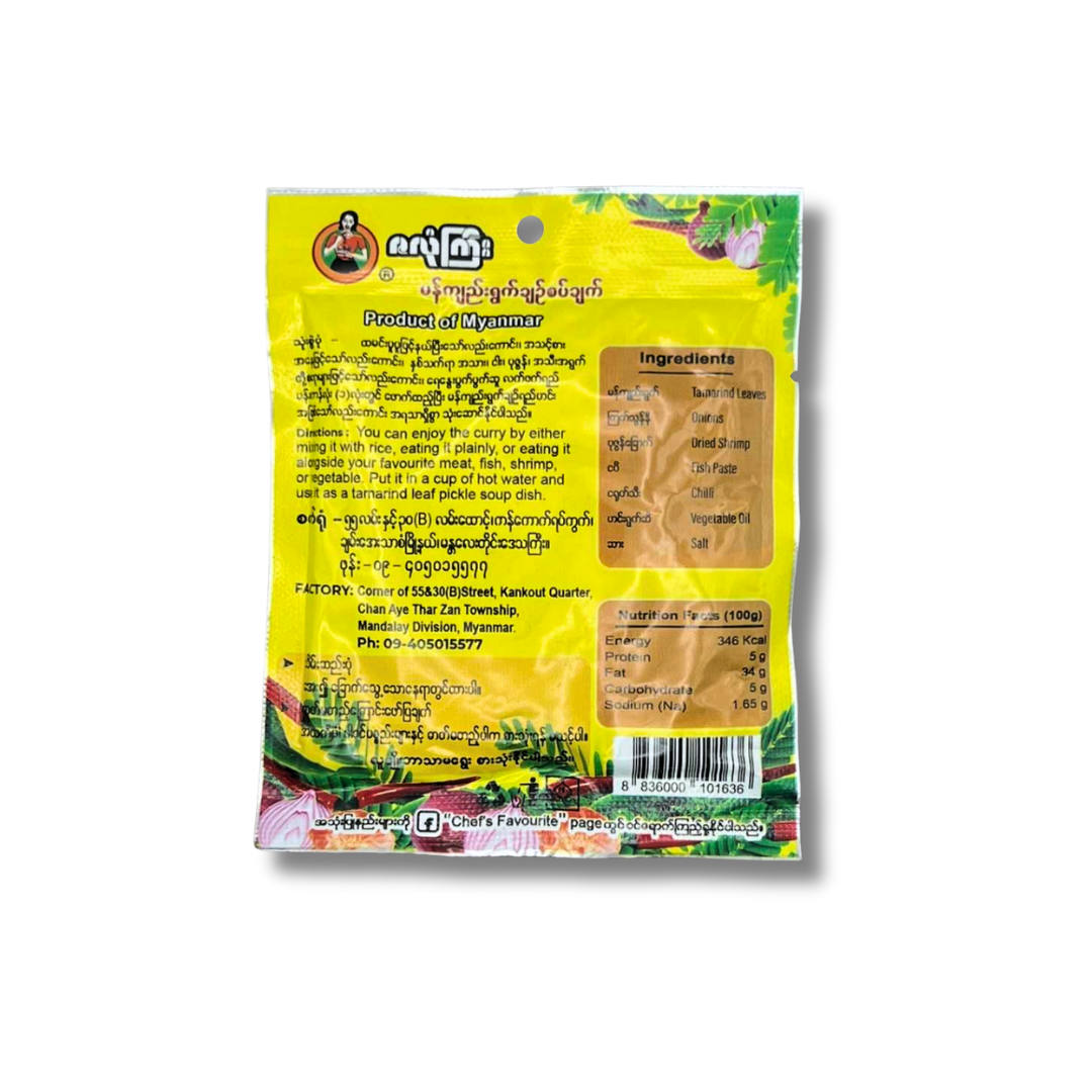 Explore the bright, tangy flavors of Burmese cuisine with Za Long Gyi (ဇလုံကြီး) Spicy and Sour Tamarind Leaves Curry (မန်ကျည်းရွက်ချဥ်စပ်ချက်). This 100% Halal certified 40g paste is a traditional mix of sour tamarind leaves, savory dried shrimp, chili, and fish paste, providing an instant burst of flavor. It's the perfect condiment to mix with warm rice for a quick, authentic meal or to use as a flavorful base for a variety of Burmese dishes.