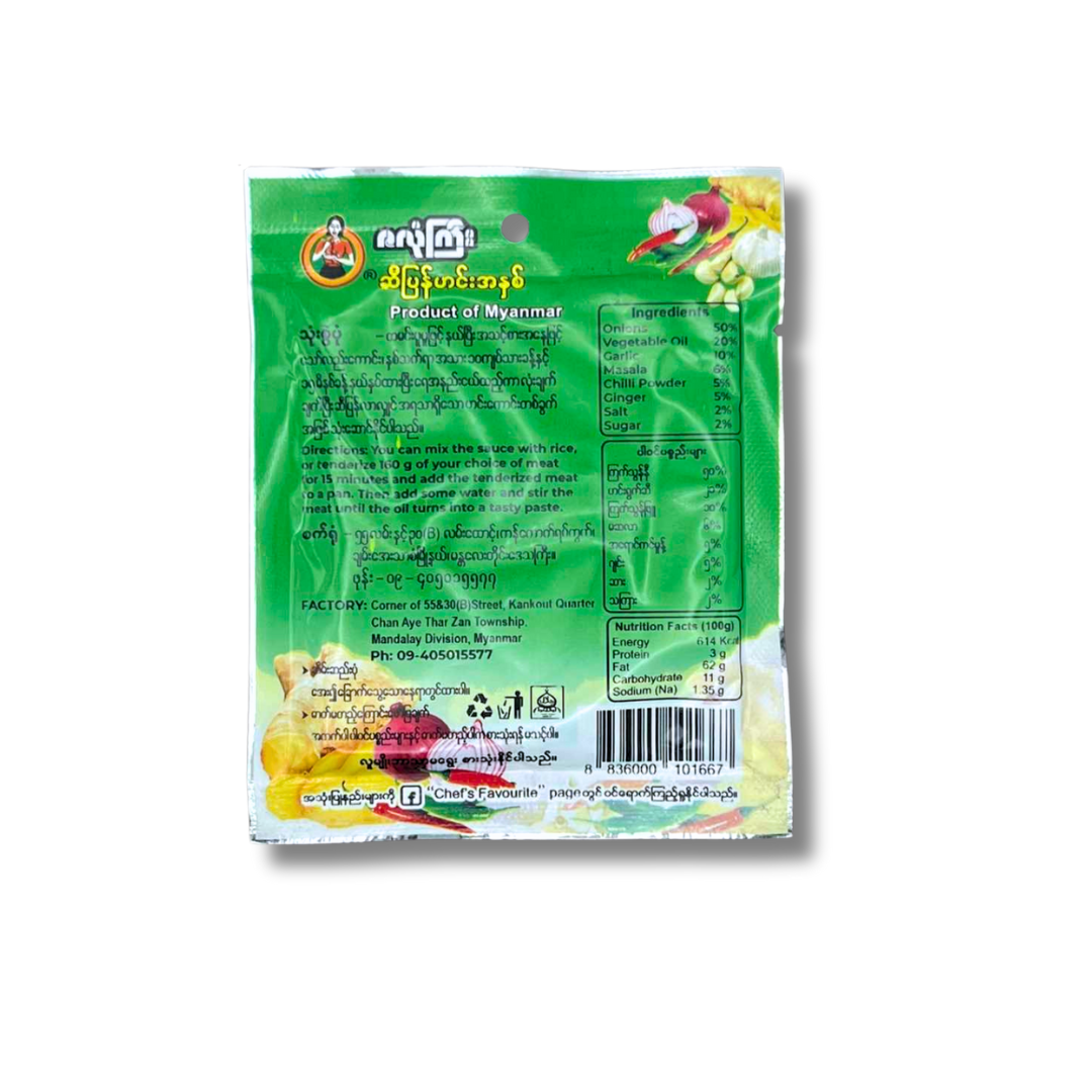Create a quick, aromatic, and savory meal with Za Long Gyi (ဇလုံကြီး) Curry Paste (ဆီပြန်ဟင်းအနှစ်). This 100% Halal certified traditional Burmese paste is blended with rich spices like masala, chili powder, ginger, and garlic for a full-bodied flavor profile. The convenient 40g packet is designed to easily make a delicious Si Byan (oil-return) style curry by simply adding your favorite meat or vegetables.