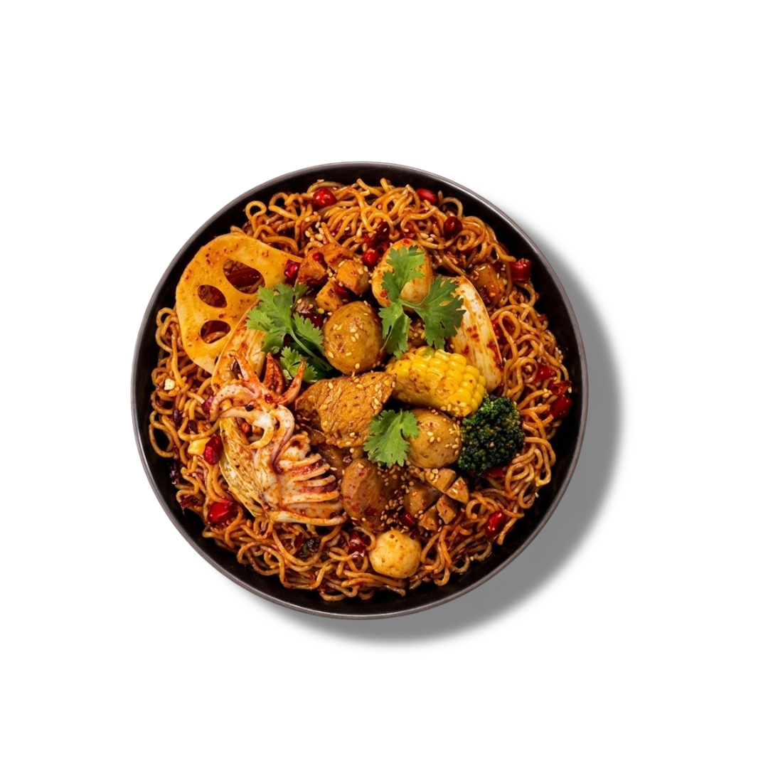 Ingredients: Wheat Flour (Contains Gluten), Palm Olein (Contains Antioxidant 321), Salt, Stabilizers (E452, E501, E412), Flavouring Substances (Contains Soybean), Food Colour, Flavour Enhancers (E621, E627, E631), Spices. Salt, Sugar, Monosodium Glutamate (E621), Palm Olein, Turmeric Powder, Garlic, Spicy Chilli Powder, Black Sweet Soy Sauce, Oleoresin Paprika (E160c), Mala Spicy Flavour.