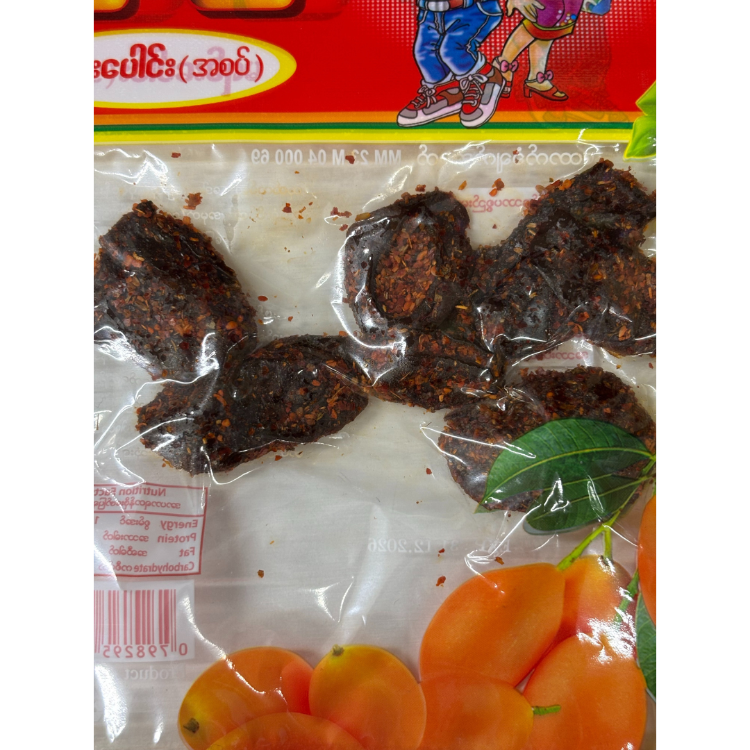 Oo Oo Marian Fruit Jam (ဦးဦး၊မရမ်းပေါင်း အစပ်) is a zesty snack from Myanmar that offers a bold "Spicy Dried Marian" flavor in a compact 40g package. The recipe balances 60% marian fruit with 30% sugar, adding a 10% blend of chili and masala to deliver a satisfyingly spicy heat. This authentic Burmese treat is perfect for those who crave a tangy, seasoned fruit snack that is easy to carry and enjoy anywhere. With its unique item code 0798295036834, it represents a popular local delicacy that combines traditional flavors with modern convenience.