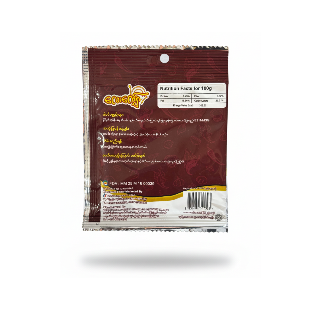 Ingredients: ကြက်သွန်နီ၊ရေ၊ဆီ၊မန်ကျည်းသီး၊ငရုတ်သီး၊ကြက်သွန်ဖြူ၊ပုဇွန်ခြောက်၊ဆား၊ငံပြာရည်၊E211၊MSG။