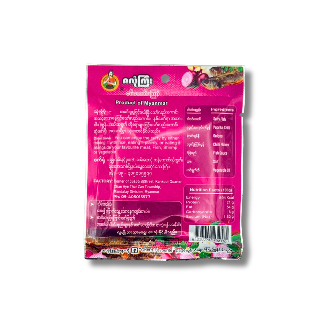 pice up your plate with Zalone Gyi (ဇလုံကြီး) Salty Fish Fried (ငပိကောင်ကြော်), a staple Burmese condiment packed with savory flavor. This rich, 100% Halal paste combines salty fish with aromatic ingredients like chili, onion, and paprika for a deep, satisfying heat. Enjoy this traditional, convenient 40g fried curry simply mixed with hot rice, eaten plainly, or served alongside your favorite meat, fish, or vegetable dishes. It’s an easy way to bring authentic Burmese depth to any meal.