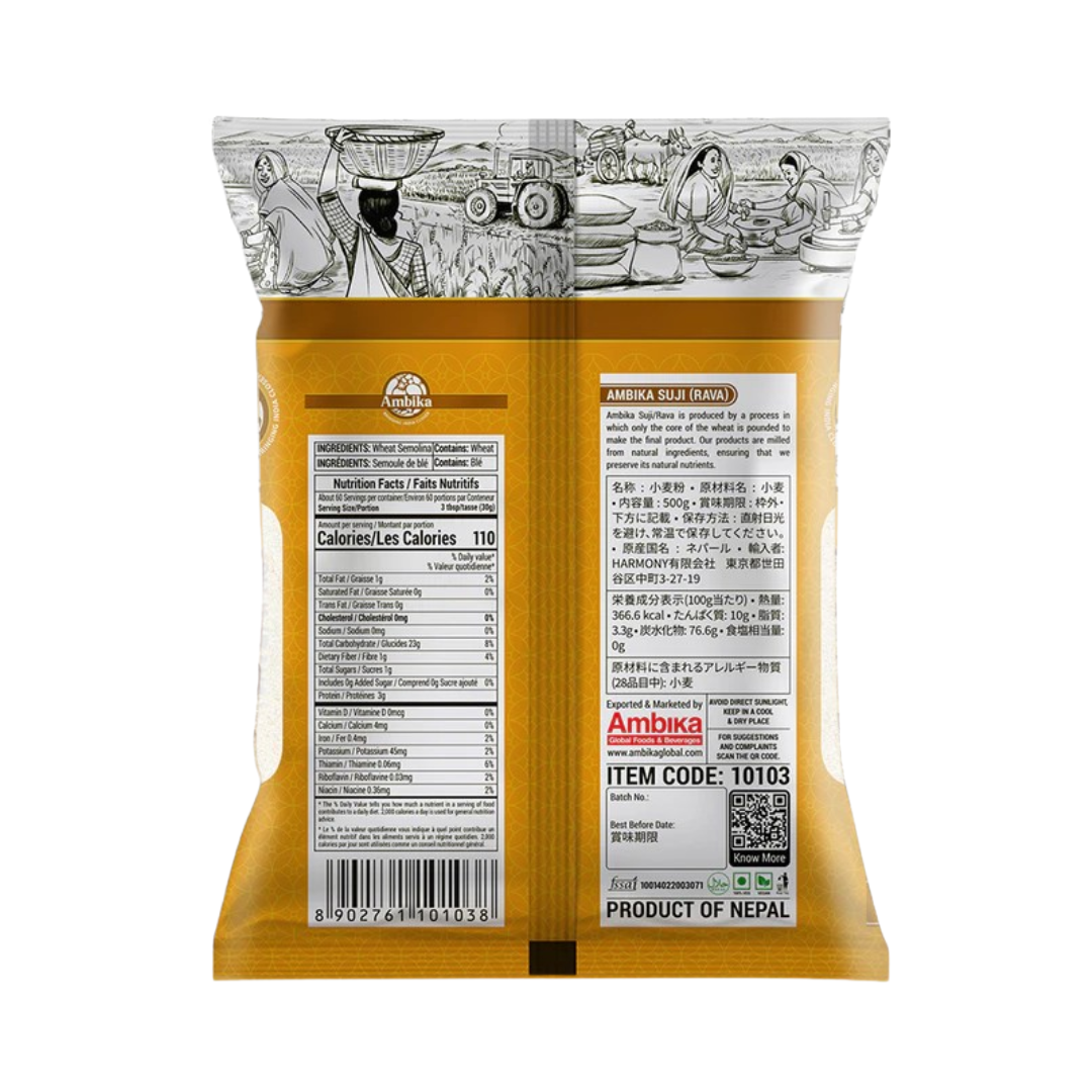 This 500g package of Ambika Suji (Rava) is a 100% Halal certified kitchen staple made from high-quality wheat semolina, serving as a versatile ingredient for Asian and Southeast Asian families. Sourced from Nepal, this fine-textured semolina is ideal for preparing traditional regional favorites ranging from sweet Sujee Halwa to savory breakfast dishes like Upma. The consistent quality of this wheat semolina ensures perfect results every time, whether you are using it to thicken desserts or create a satisfying, grainy texture in snacks. Store this pack in a cool, dry place to maintain its freshness for all your authentic home-cooked meals.